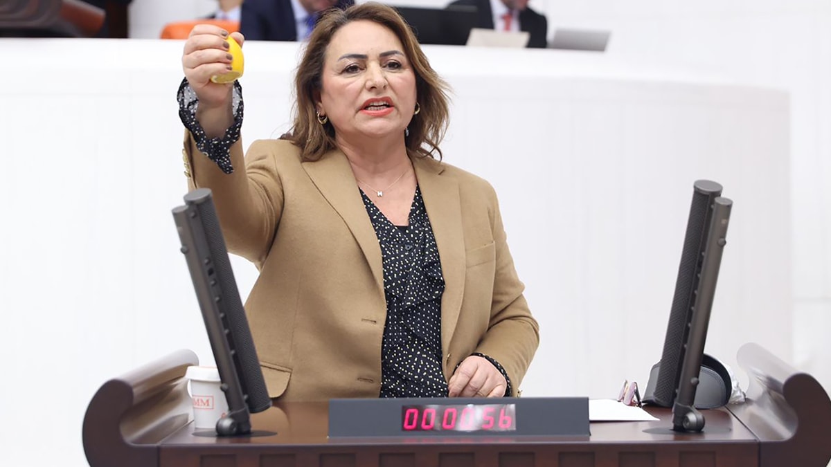 CHP’li Dr. Şevkin, konuşmasının sonunda elindeki limonu sıkarak, AKP’nin vatandaşı adeta limon gibi sıktığını belirtti.