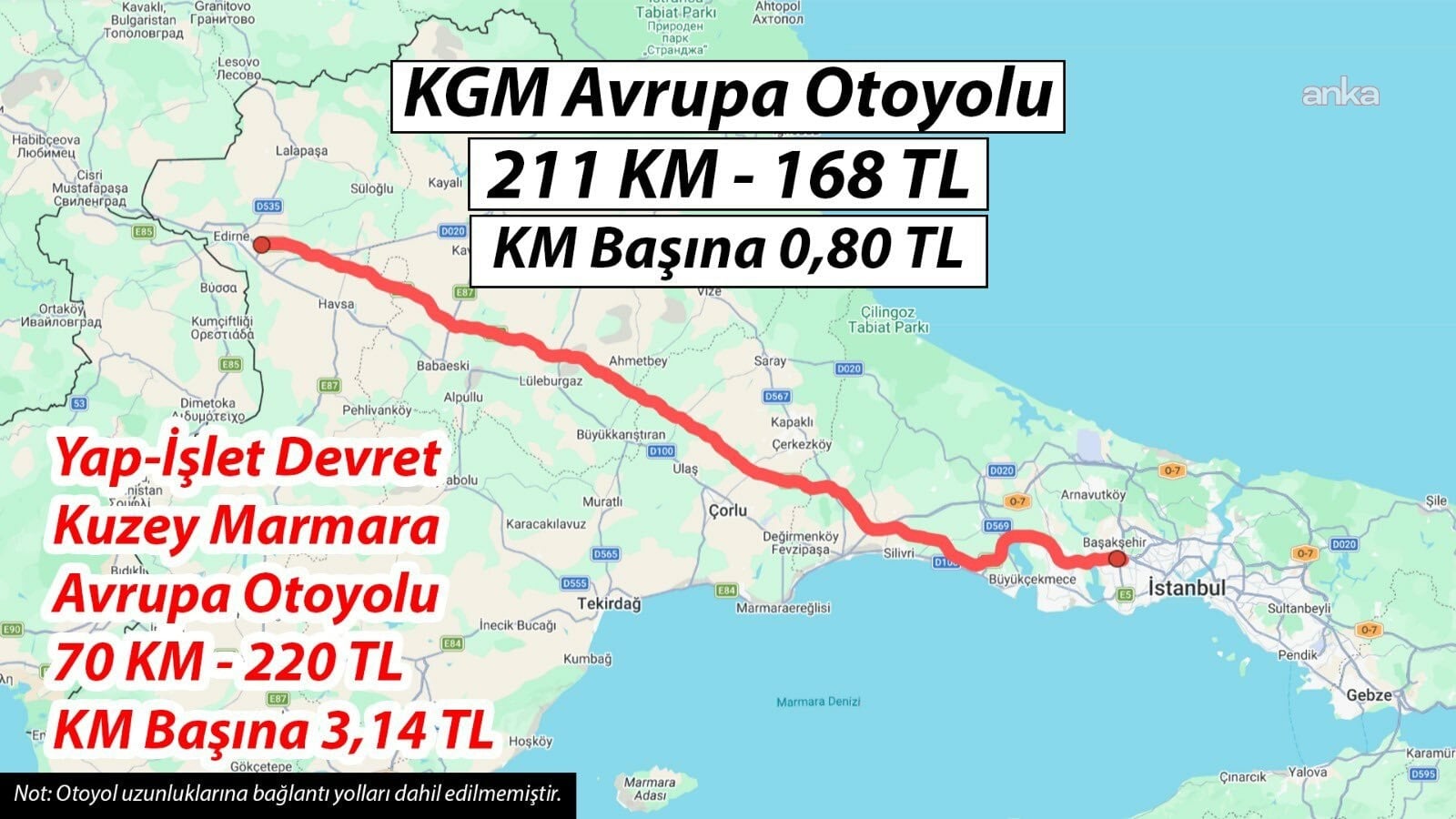Kuzey Marmara Avrupa Otoyolu (Özel): Kilometre başına 3,14 TL.
