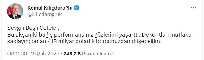 Öte yandan sosyal medya hesabından açıklamada bulunan Kılıçdaroğlu, "Sevgili Beşli Çeteler,