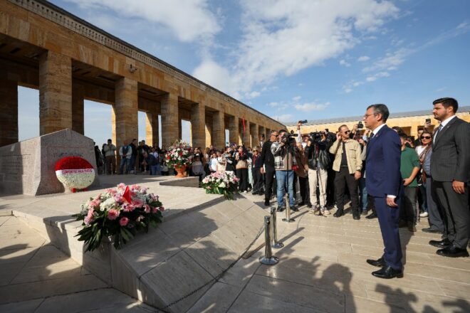 Özel ve beraberindekiler, Aslanlı Yol'dan yürüyerek Atatürk'ün mozolesine geldi. Özel'in mozoleye çelenk bırakmasının ardından saygı duruşunda bulunuldu.
