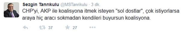 HDP Eş Başkanı Selahattin Demirtaş’ın “Ak Parti ve CHP bizim ilkelerimizi de içine alacak bir koalisyon kurarsa biz dışarıdan destek sunarız” şeklinde sözlerine gönderme yapan Sezgin Tanrıkulu, "CHP'yi, AKP ile koalisyona itmek isteyen 'sol dostlar', çok istiyorlarsa araya hiç aracı sokmadan kendileri buyursun koalisyona” şeklinde mesaj yazdı. İşte Tanrıkulu’nun mesajı:
