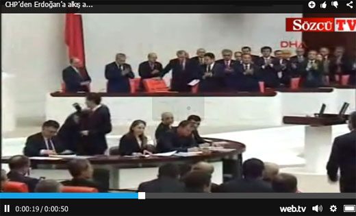 Erdoğan, muhalefeti suçlayarak, "Şantaj görüntü ve ses kayıtlarının TBMM'yi nasıl hedef aldıklarını gördük. Siyasi partilerin bu şantaj odaklarıyla işbirliği yaptığına şahit olduk." dedi. Erdoğan'ın bu sözleri üzerine CHP Grup Başkanvekili Engin Altay söz alarak, "Böyle bir günde bizi yabancılar ile iş birliği yapmakla suçlamasını kendisine iade ediyorum" dedi. Altay'ın cevabı büyük alkış aldı.