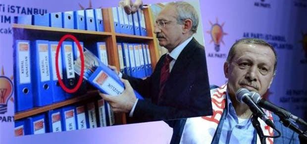 Başbakan Erdoğan, dün partisinin İstanbul ilçe belediye başkan adaylarını açıkladığı toplantıda, kürsüden bir fotoğraf paylaşmıştı. Fotoğrafta, Kılıçdaroğlu, aralarında CHP İstanbul Büyükşehir Belediye Başkan Adayı Mustafa Sarıgül'ün de olduğu, çok sayıda ismin yer aldığı yolsuzluk dosyaları önünde görülüyordu.