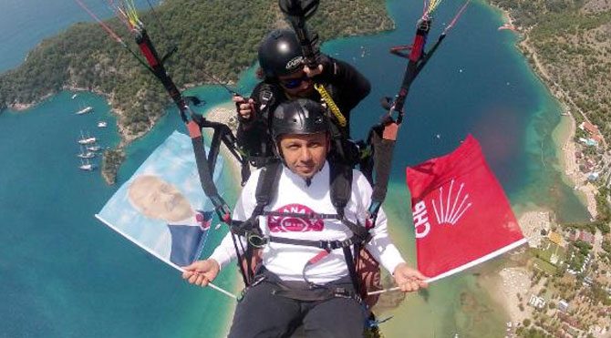 Paraşüt kamerasından seçmenlere seslenen evli ve 1 çocuk babası Burak Erbay, "Yaşanacak bir Türkiye için CHP'ye oy verin" dedi. Bayrak ve flamalarla 25 dakika Ölüdeniz semalarında uçan Erbay ve pilotu Belceğiz Plajı'na sorunsuz indi.