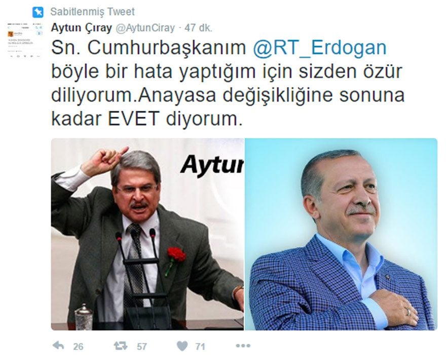 Çıray, SÖZCÜ’ye yaptığı açıklamada ‘’Atılan twitlerle ilgim yok, hesabını hacklediler’’ dedi. Çıray adına atılan twitlerde ‘’Sn. Cumhurbaşkanım @RT_Erdogan böyle bir hata yaptığım için sizden özür diliyorum. Anayasa değişikliğine sonuna kadar EVET diyorum’’ denildi. Bir başka sahte tweet paylaşımında da ‘Ben Chp Milletvekili Aytun Çıray bende EVET diyorum. #ÜlkeninBekasıİçinEVET. 1980 askeri anayasası ile 15 Temmuzda darbe yapmaya kalktılar. Bu yüzden acil ivedi Anayasının değişmesi lazım. Demokrasi için EVET’’ denildi.