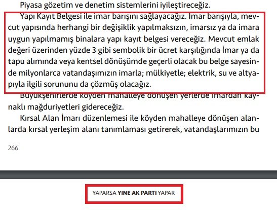 AKP iktidarında toplamda 8 kere imar affı getirildiğini hatırlatan Başarır, “AKP’nin 2018 seçim beyannamesinin imar başlıklı bölümünü tüm vatandaşlarımızın okumasını rica ediyorum. İmar barışında ne diyor bakalım? ‘Yapı kayıt belgesiyle imar barışını sağlayacağız’ diyorlar. Devamında da ‘İmarsız ya da imara uygun yapılmamış binalara yapı kayıt belgesi vereceğiz’ diyor. 2018 seçim beyannamesi bu. Aslında felaket seçim beyannamesinde yazılmış” dedi.