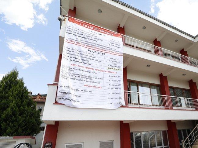 Belediyenin hizmet binasına asılan dev afişte son bir yılın gelir gider durumu, önceki dönem borçları ve güncel borçlar yer aldı.