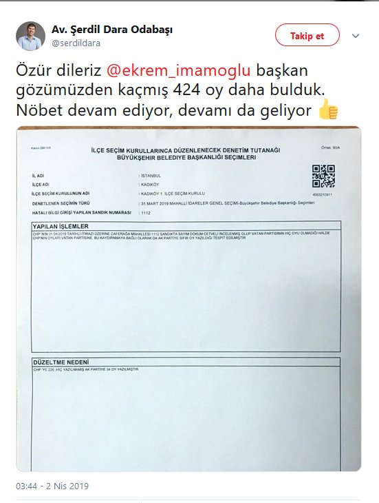 Kadıköy'ün yeni seçilen CHP'li Belediye Başkanı Şerdil Dara Odabaşı Twitter hesabından yaptığı paylaşımda Ekrem İmamoğlu'nu etiketleyerek "Özür dileriz Ekrem İmamoğlu başkan gözümüzden kaçmış 424 oy daha bulduk. Nöbet devam ediyor, devamı da geliyor" ifadelerini kullandı.CHP TAM KADRO İSTANBUL NÖBETİNE BAŞLADI