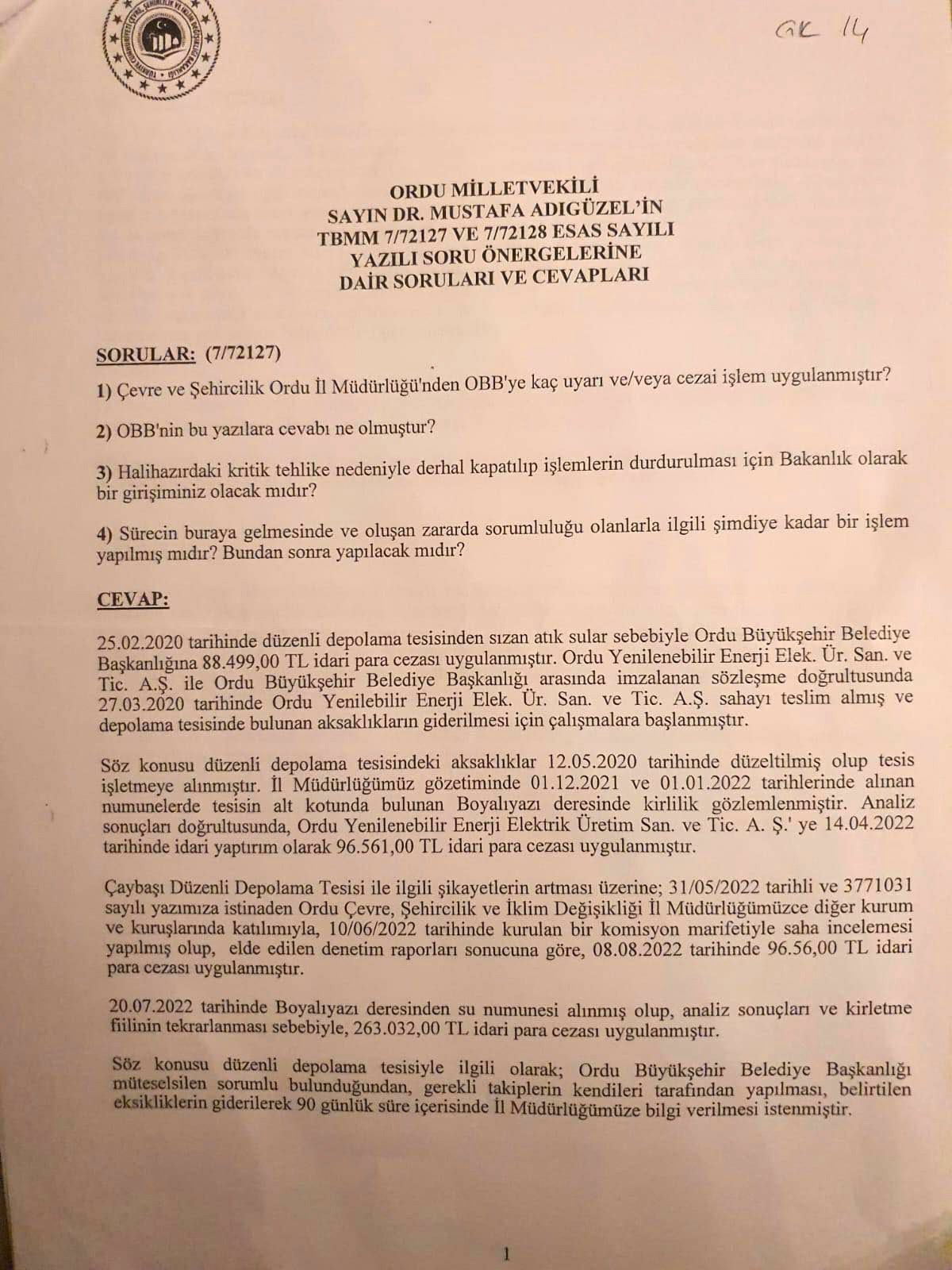 Büyükşehir Belediye Başkanı Hilmi Güler, eksikliklerin giderileceğini söylemesine rağmen tesisten pis suların sızıp dereye karıştığı CHP Ordu Milletvekili Mustafa Adıgüzel tarafından tespit edildi.