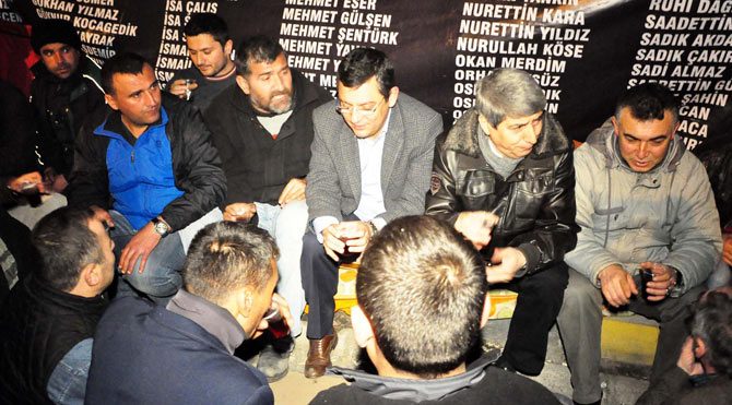 MANİSA'nın Soma İlçesi'nde, 301 madencinin yaşamını yitirdiği facia ardından işten çıkartılan madenciler tarafından, tazminatlarının ödenmediği gerekçesiyle başlatılan oturma eyleminin 3'üncü gününde CHP Manisa Milletvekili Özgür Özel, işçileri ziyaret ederek destek verdi.Milletvekili Özel, Türkiye'nin en büyük maden faciası ardından işten çıkarılan 2 bin 832 maden işçisi, aradan geçen 3 aya rağmen tazminatlarını alamayan maden işçileri ziyaret ederek TKİ Kurumu Ege Linyitleri İşletmesi (ELİ) önünde başlattıkları oturma eylemine bir süre katıldı. İşçilerden Hidayet Merdim, 13 Mayıs'ta yaşadıkları faciadaki o günleri hatırlamak istemediğini anlatırken şöyle dedi: