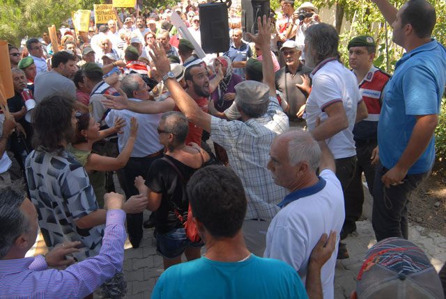 Karşılıklı açıklamaların ardından Çevre ve Şehircilik İl Müdürlüğü'nden gelen heyet toplantıyı başlatmak istedi. Bu sırada avlusunda toplantı yapılan Camiye 'RES'e evet' yazılı pankartın asılması, tepkilerin yeniden başlamasına neden oldu. Camiye doğru giden çevreciler ile onlara engel olmak isteyen firma çalışanları arasında, arbede çıktı. Tarafların birbirlerine dövizlerin sopalarıyla vurmaya başlamasıyla jandarma müdahale etti. Tarafları ayırdı. Çevrecilerin bu sırada protestoları da devam etti.