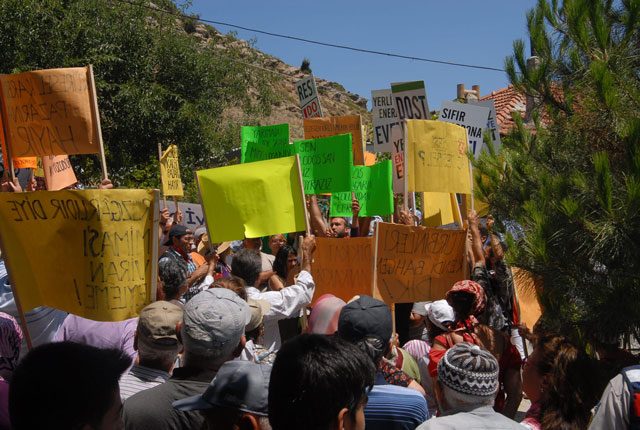 Toplantı yapılacağı haberini alan çevreciler ve türbin direklerinin dikilmesinin planlandığı köylerde oturan vatandaşlar haberin yayılması üzerine Karaburun merkezde toplandılar.