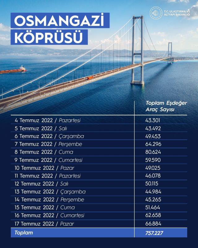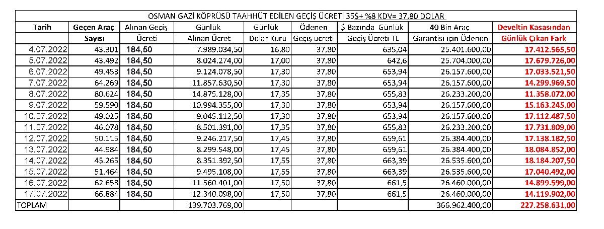 Osmangazi Köprüsü’nden 4 – 17 Temmuz tarihleri arasında geçen araçların sayılarını paylaşan Yalım, “Arife günü köprüden 80 bin 624 araç geçtiği, garanti karşılama oranının yüzde 202’lere çıktığı söylendi. Geçiş sayılarının tuttuğu doğrudur. Köprüyü kullanan birinci sınıf araçlardan 184 lira 50 kuruş geçiş ücreti alınıyor. Fakat araç başına şirkete 35 Dolar ücret ve yüzde 8 KDV ödenmektedir. Kura göre hesaplandığında gerçek olan ortada bir zarar olduğudur” ifadelerini kullandı.