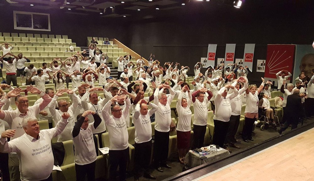 Başta CHP Genel Başkan Yardımcısı Cankurtaran olmak üzere katılımcılar Atatürk'ün sözleri olan tişörtleriyle 5 dakika süreyle toplantı salonunda yapılan antrenmana eşlik etti.