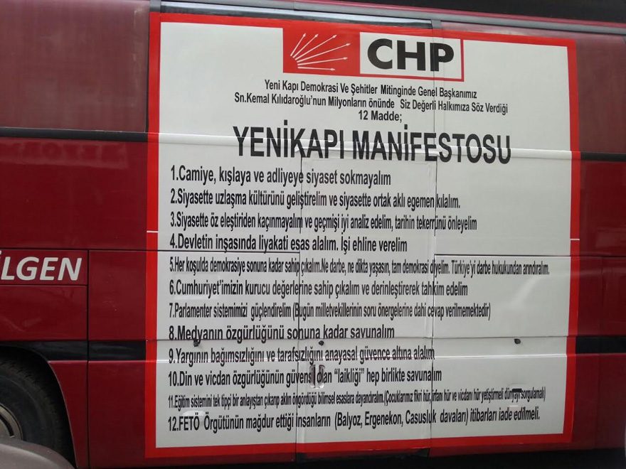 CHP Genel Başkanı Kemal Kılıçdaroğlu’nun “Yenikapı Manifestosu” başlığında halka duyurduğu bildirinin yazılı olduğu otobüse, 19 Ekim 2016 Çarşamba günü sabah saatlerinde İstanbul E-5 üzeri Bostancı mevkii yan yolda park halindeyken boyalı saldırıda bulunuldu. 25. dönem CHP ön seçim milletvekili adayı Kazım Bilgen’e ait olan araca daha önce 2 kez aynı tarzda saldırı gerçekleşmiş ve saldırının failleri bulunamamıştı.