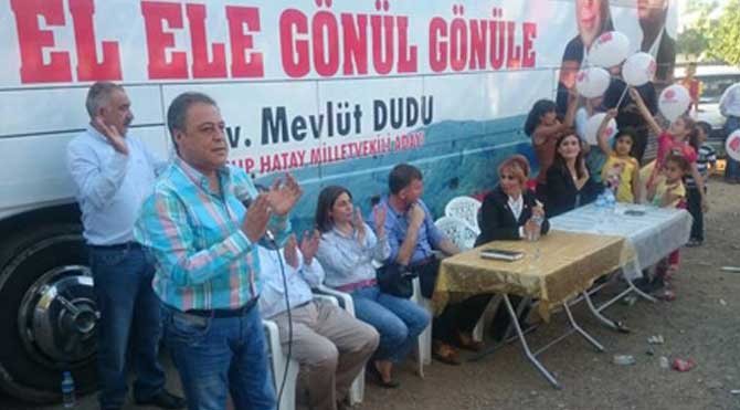 CHP Hatay Milletvekili Av. Mevlüt Dudu ve beraberindeki partililer çalışmalarına Arsuz’da başladı. İskenderun Güney Eğitim Vakfı'nın Arsuz Karaağaç plajında düzenlediği; Yaza Merhaba Şenliğine katılan Dudu, şenliğe katılanlarla tek tek görüşerek, herkese iyi eğlenceler dileyip sohbet etme fırsatı buldu. Şenlik coşkusunun seçim coşkusuyla birleştiğini söyleyen Dudu, “çalışmalarımız çok güzel gidiyor. Halkımızın CHP'ye desteği muhteşem, CHP’nin projeleri ile halkımız yaşanacak bir Türkiye’ye kavuşacak, artık zamanı geldi, 8 Haziranda CHP iktidar, Kemal Kılıçdaroğlu’da Başbakan olacaktır” dedi.Çeşitli ev ziyaretleri yaparak seçim çalışmalarına devam eden Dudu, akşam saatlerinde İskenderun’da; Gültepe 397 sokakta düzenlenen CHP mahalle toplantısına katıldı. Milletvekili adayı arkadaşları ile halkla bir araya gelen ve yoğun ilgiyle karşılanan Dudu, “Halkımızın ilgisi ve desteği bizi coşturuyor. CHP gümbür gümbür geliyor. Herkes görsün, herkes duysun, faize ve ranta dayalı ekonomi yaratanları, yolsuzluklarla köşeyi dönenleri, 8 Haziranda hep birlikte sıfırlayacağız” dedi. Konuşması sırasında halkın yoğun tezahüratıyla sık sık konuşması kesilen Dudu, mitinge dönüşen mahalle toplantısında çok gururlandıklarını dile getirdi.