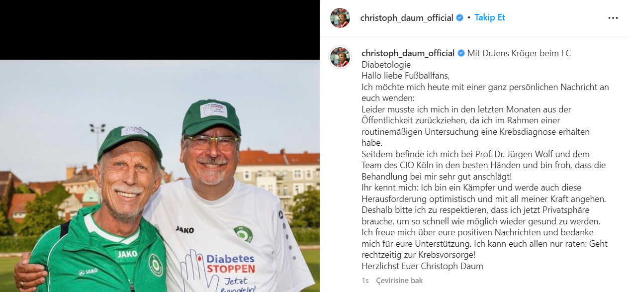 "Merhaba sevgili futbolseverler, bugün sizinle kişisel bir mesajımı paylaşmak istiyorum. Ne yazık ki, rutin sağlık kontrollerim sırasında kanser teşhisi konulduğu için son birkaç aydır kamuoyundan uzaklaşmak zorunda kaldım. O zamandan beri Prof. Dr. Jürgen Wolf ve CIO Cologne ekibine emanetim. Ve tedavinin benim için çok iyi sonuç vermesinden dolayı mutluyum."