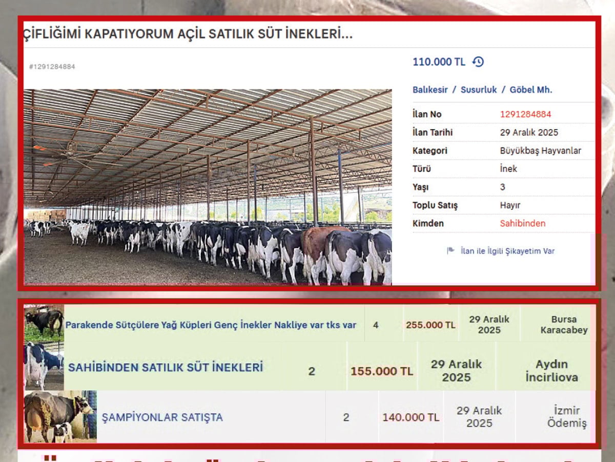 Yüksek üretim maliyetleri, bu yıl etkili olan şap hastalığı, çiğ süt fiyatlarının maliyetleri karşılayamaması nedeniyle hayvancılık sektörü iflas sinyalleri veriyor. Türkiye’de ağırlıklı olarak aile işletmelerinin yer aldığı süt hayvancılığında sektör temsilcileri uzun süredir küçülme uyarıları yaparken üretici de çareyi hayvanlarını satışa çıkarmakta buldu. Özellikle gayrimenkul ve araç satışı ile bilinen bir sitede son baktığımız saatlerde ‘satılık inek cinsleri’ başlığında 1.093 ilanla farklı sayılarda buzağı, inek ve sığırlar satışta görünüyor.