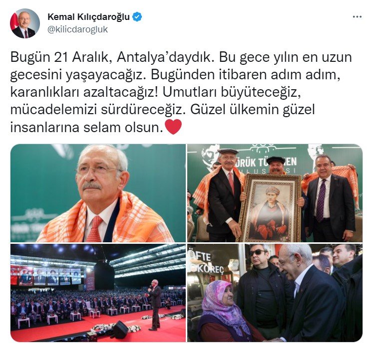 Kılıçdaroğlu, "Bugün 21 Aralık, Antalya’daydık. Bu gece yılın en uzun gecesini yaşayacağız. Bugünden itibaren adım adım, karanlıkları azaltacağız! Umutları büyüteceğiz, mücadelemizi sürdüreceğiz. Güzel ülkemin güzel insanlarına selam olsun." ifadelerini kullandı.