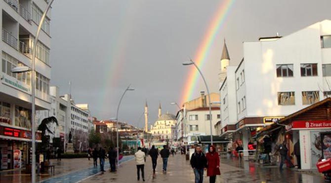 Cadde de bulunan vatandaşlar fotoğraf çekip, selfie yaptılar.Kent merkezinde akşama doğru yağan hafif yağmurun ardından çift gökkuşağı oluştu. Yağmurun ardından çıkan birisi daha az belirgin olan çift gökkuşağı eşsiz bir manzara yarattı. İzzet Baysal Caddesi'nde yürüyen vatandaşlar cep telefonları ile gökkuşağını fotoğraflayıp, selfie yaptılar. Gökyüzünde oluşan çift gökkuşağı eşsiz güzelliğini vatandaşlar hayranlıkla izledi. BOLU, (DHA)