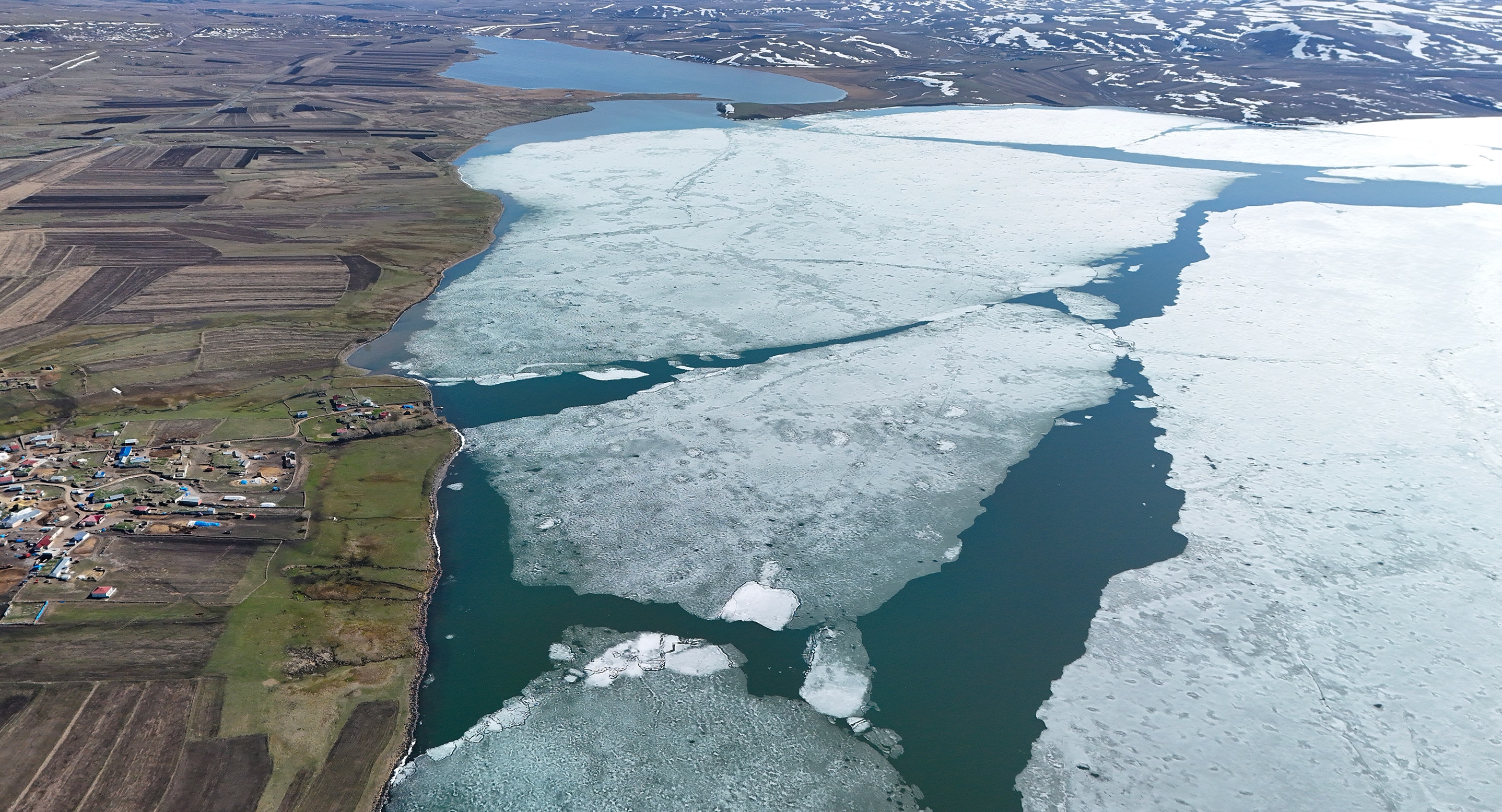 Kars-Ardahan sınırındaki Çıldır Gölü'nün yüzeyinde soğuk hava nedeniyle geçen yıl aralık ayında oluşan buz tabakaları 5 ay sonra erimeye başladı. Gölün yüzeyindeki buzların erimesi Kars'ın Çanaksu köyü mevkisinde dron ile görüntülendi.