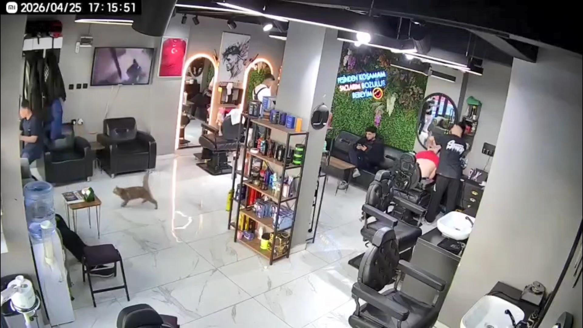 Çevredeki vatandaşların şaşkın bakışları arasında sokağa doğru kaçan müşteri, bir süre sonra hızla kuaför salonuna geri döndü. Kedinin ise merdivenlere kadar müşterinin peşinden bir kez daha koştuğu, ardından sokağa geri döndüğü görüldü.