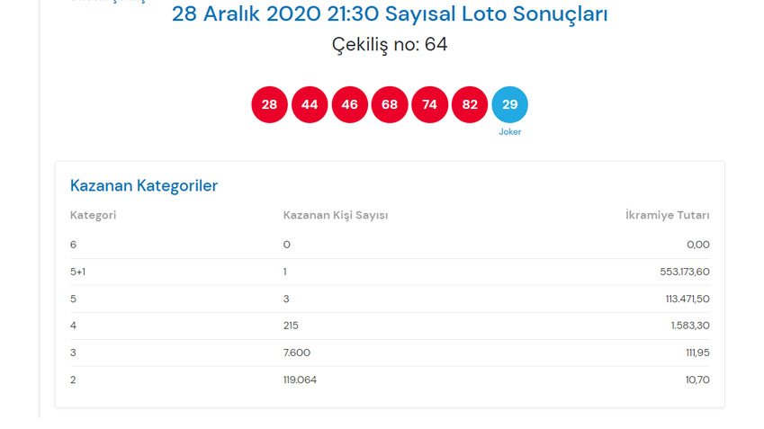 28 Aralık Çılgın Sayısal Loto‘nun çekiliş sonuçları, “8-44-46-68-74-82 Joker: 29” oldu.