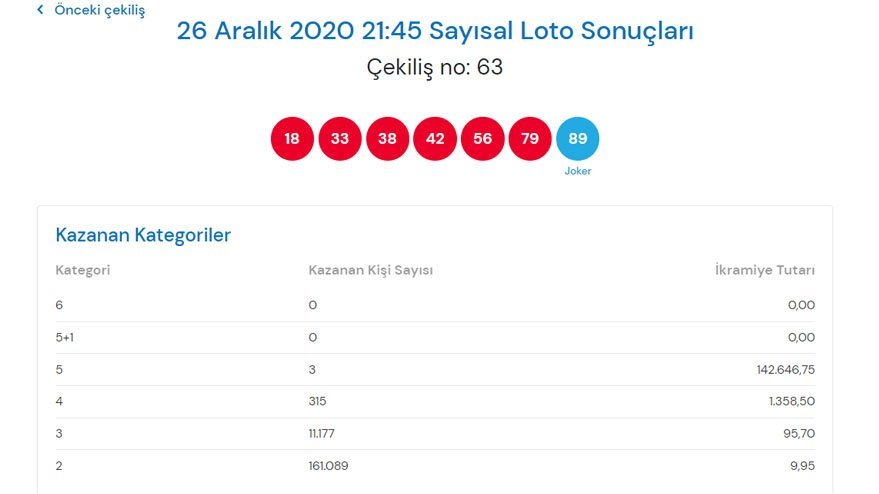 26 Aralık Çılgın Sayısal Loto‘nun çekiliş sonuçları, “18-33-38-42-56-79 Joker: 89” oldu.