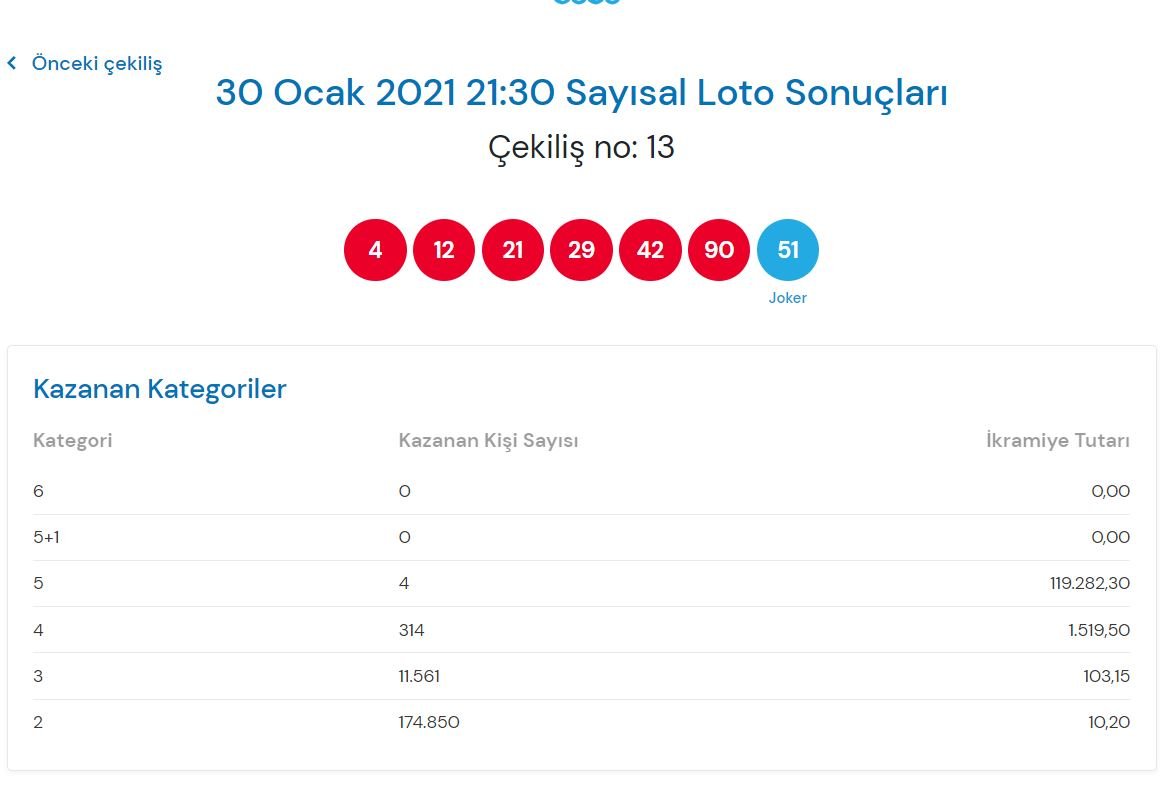 Çılgın Sayısal Loto'nun 30 Ocak tarihli 13. çekilişinde şanslı rakamlar “4-12-21-29-42-90-joker 51” olarak açıklandı.