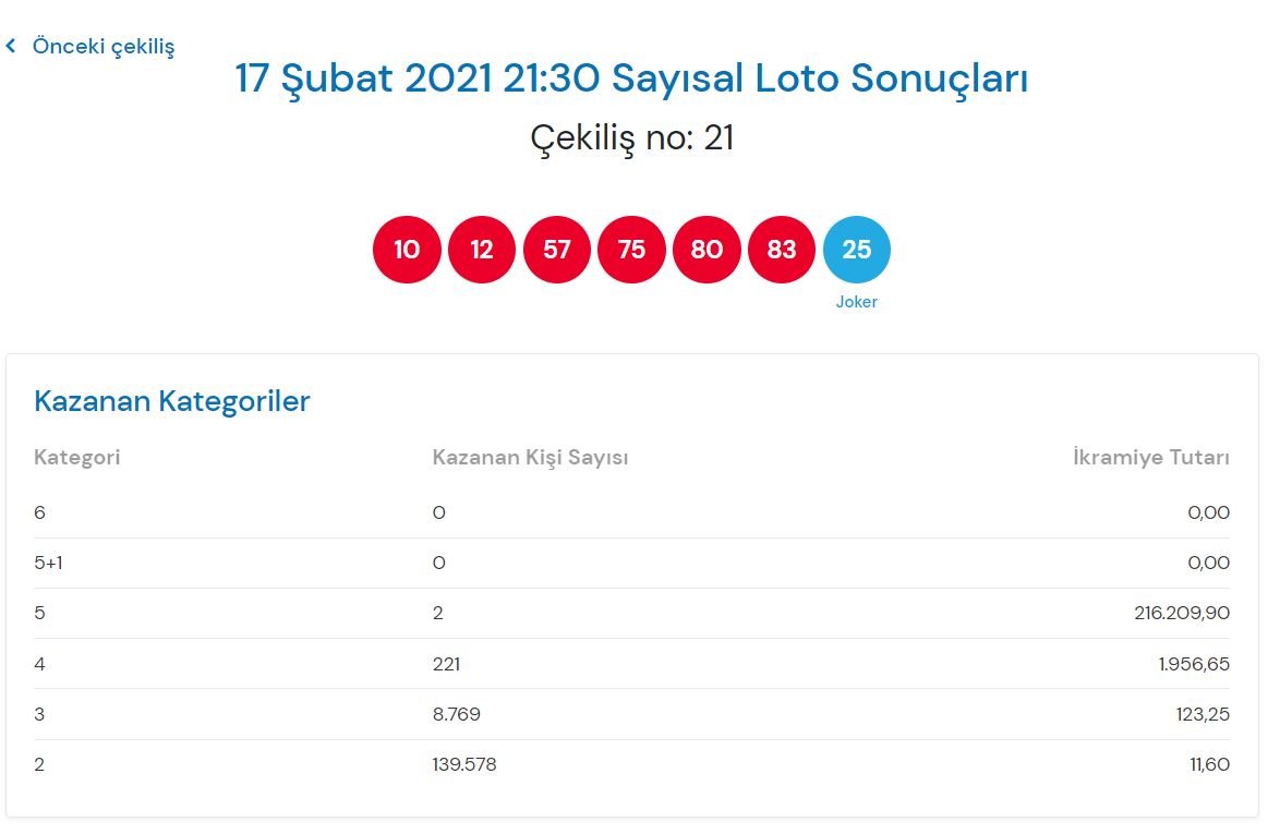 17 Şubat Çılgın Sayısal Loto‘nun çekiliş sonuçları, ‘10-12-57-75-80-83- joker 25′ oldu.