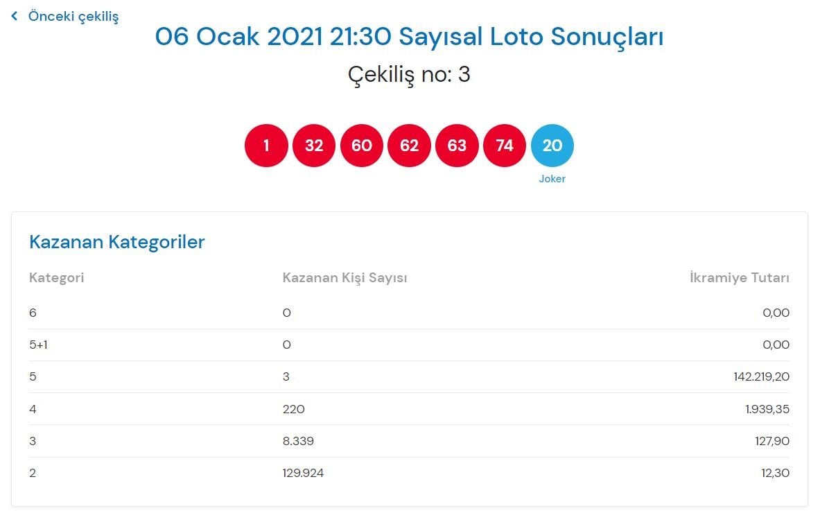 Çılgın Sayısal Loto’nun 6 Aralık tarihli 3. çekilişinde şanslı rakamlar “1-32-60-62-63-74-joker 20” olarak açıklandı.