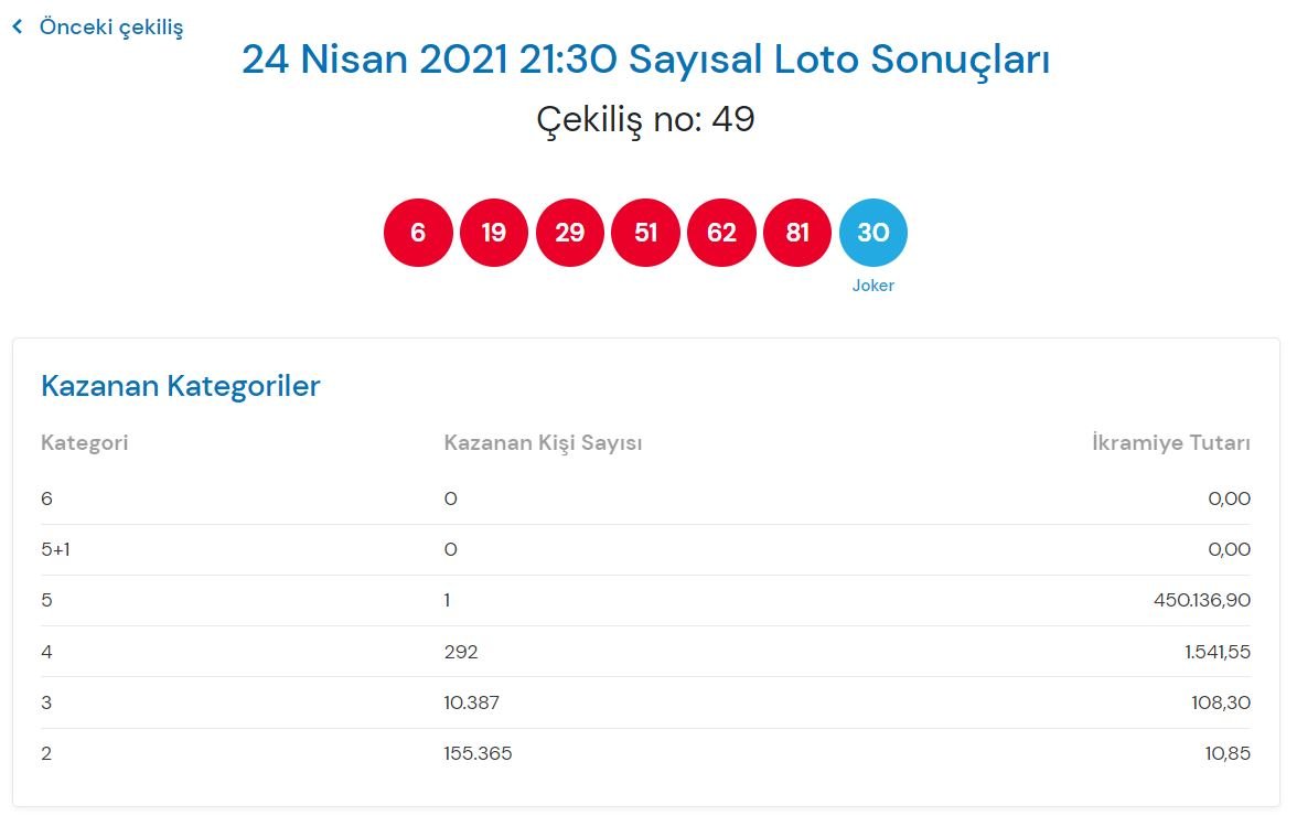 Çılgın Sayısal Loto’nun 24 Nisan tarihli çekiliş sonuçları şu şekilde: 6-19-29-51-62-81- joker 30
