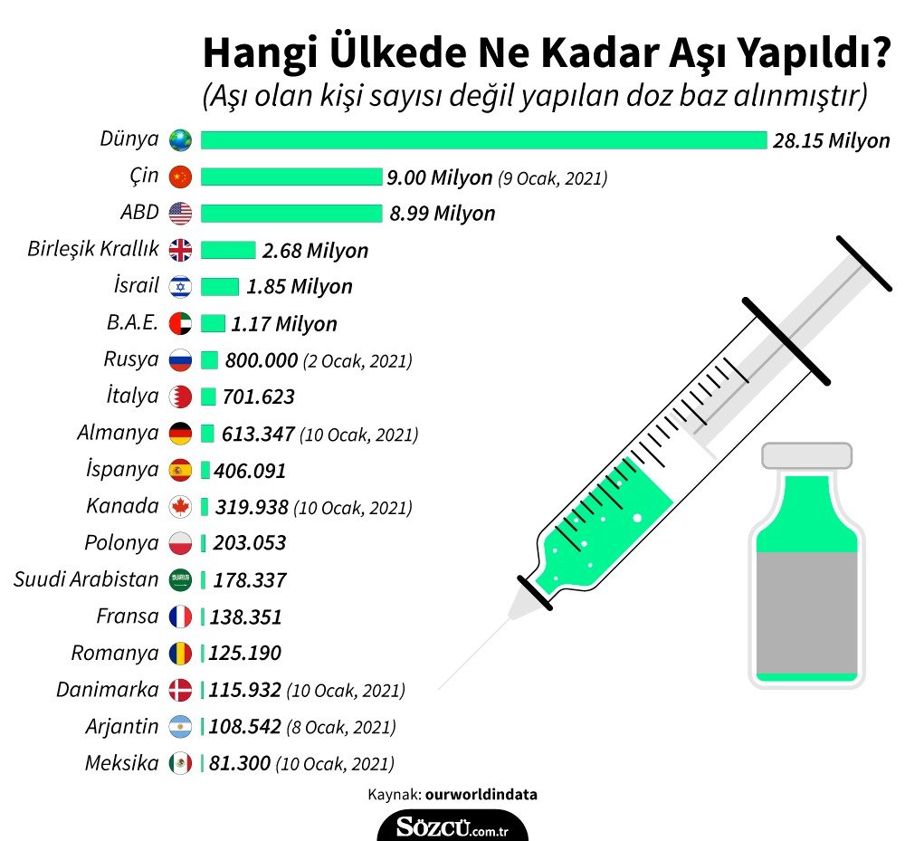 Dünyada 46 ülke aşılamaya geçti. Pfizer/Biontech ve Moderna aşıları için kullanım onayı alan ülkeler şu an ciddi bir ilerleme kaydetti. Türkiye'de perşembe veya cuma günü aşılamaya başlanması bekleniyor. Zira aşı çalışmalarının yapıldığı Türkiye, Endonezya ve Brezilya’nın Faz3 sonuçlarını açıklayıp SinoVac şirketi tarafından bir ortalama etkinlik açıklanması bekleniyor.