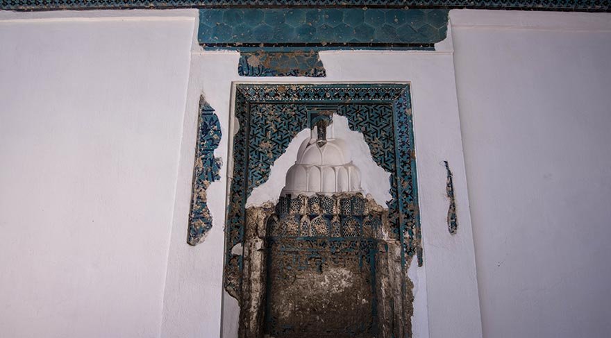 Eyvanın güney duvarında çinileri dökülmüş mihrap bulunuyor.