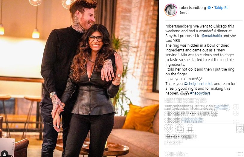 Şef sevgilisi uğruna sektörden ayrılıp, spikerlik yapmaya başlayan Mia Khalifa, ünlü şef sevgilisi Robert Sandberg'in, evlilik teklifine "evet" dedi. Şef sevgilisi Robert Sandberg ise Instagram'da şöyle yazdı: "Bu hafta sonu Chicago'ya gittik ve Smyth'de harika bir akşam yemeği yedik. Mia Khalifa'ya evlenme teklif ettim ve 'evet' dedi" ifadelerini kullandı.