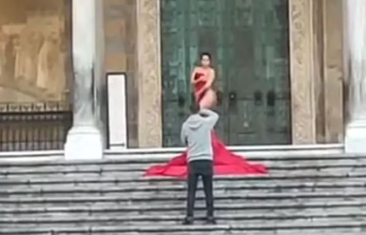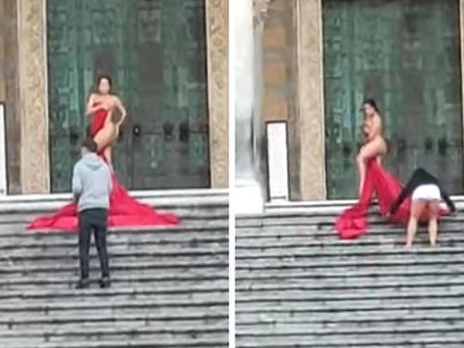 İtalyan medyası kadının İngiliz bir influencer (sosyal medya fenomeni) olduğunu yazarken, kadına bir İngiliz kadın ile birlikte bir fotoğrafçının da eşlik ettiğini yazdı. Kilisenin merdivenleri önünde kırmızı bir örtü ile poz veren kadın bölgede şok etkisi yaratırken kilisenin de arka fon olarak kullanılması büyük eleştiri topladı.