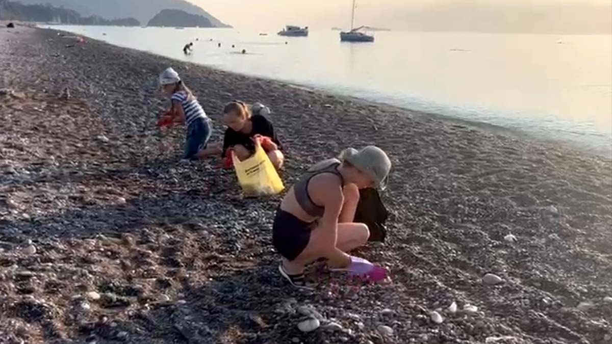 Çıralı Sahili'nde biri çocuk, 3 Rus turist, atılan çöpleri topladı.