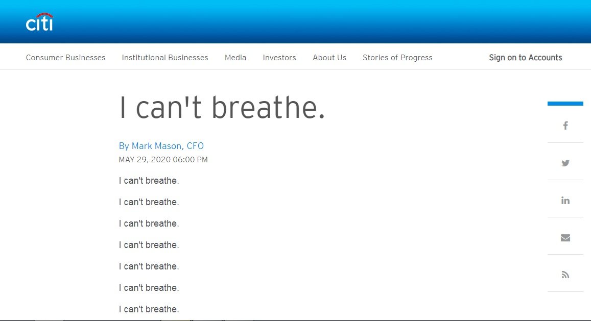 ABD merkezli bankanın mali işler müdürü (CFO) ve Wall Street'in az sayıdaki siyah yöneticilerinden olan Mark Mason, "Nefes alamıyorum" başlıklı bir yazı kaleme aldı.