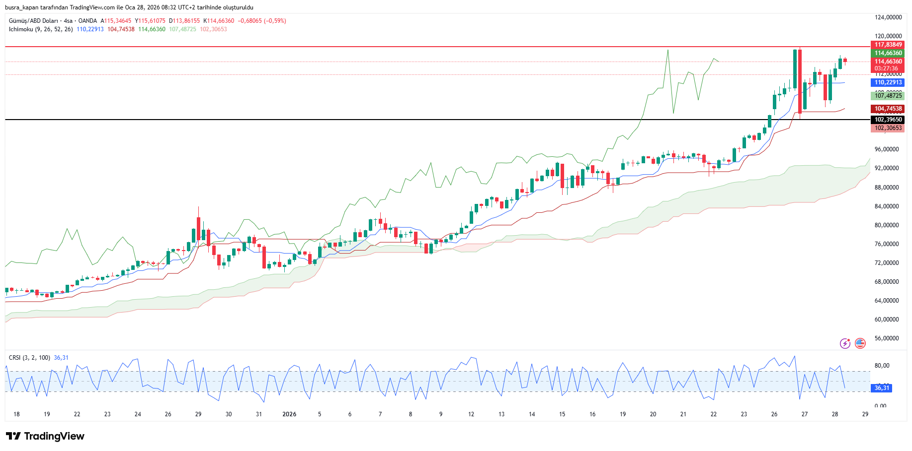 Gümüş, Pazartesi günü yaklaşık yüzde 14 artışla 117,71 dolarla yeni bir rekor kırdı. Bu artış, 2008 küresel finans krizinden bu yana görülen en büyük gün içi yükseliş olarak kayıtlara geçti.