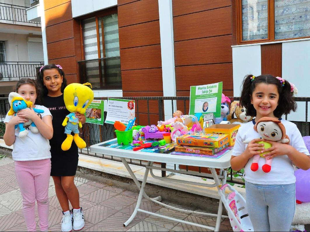 Manisa Şehzadeler ilçesi Peker Mahallesi'nde ilkokul öğrencisi Melis Sarıkaya (8), Öykü Sarıkaya (6) ve Zeynep Masal Taşoğlu (7) oturdukları apartmanın önüne serdikleri oyuncaklarını satışa çıkarttı. Çocuklarının Turgutlu ilçesinde yaşayan SMA Tip1 hastası İrem Nur Çakto için oyuncaklarını sattıklarını öğrenen aileler de çocuklarına destek verdi. Kampanya mahallede büyük ilgi görürken, çevredekilerde oyuncak alarak çocuklara destek verdi. Çocukları adına, İrem Nur bebeğin annesi Ceylan Çakto ile irtibata geçen aileler, çocuklarının topladığı 700 lirayı İrem Nur için açılan bağış hesabına gönderdi. Anne Ceylan Çakto ise sosyal medya hesabından çocuklara ve ailelerine teşekkür etti.