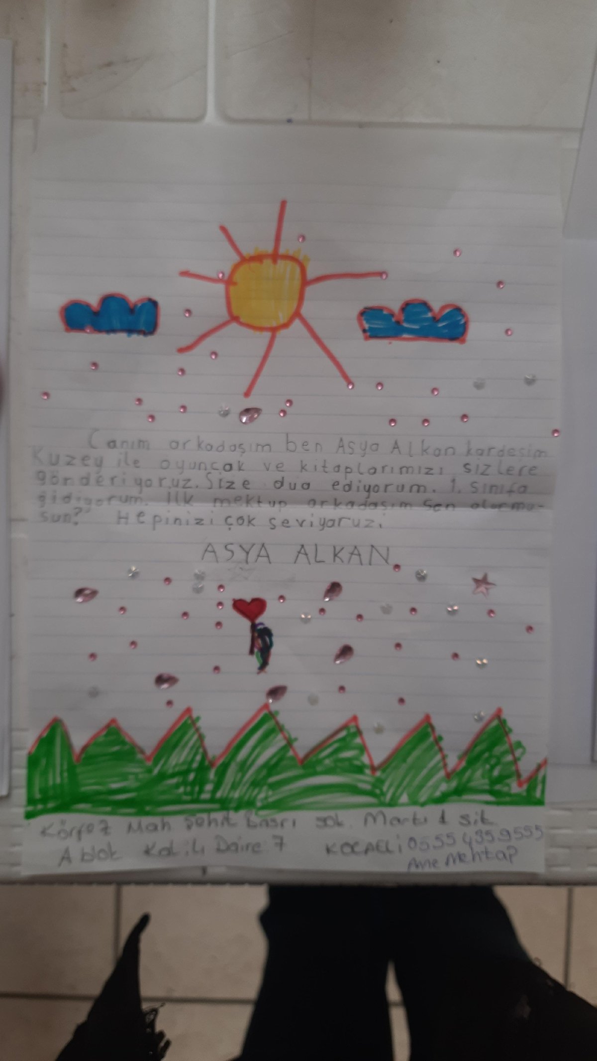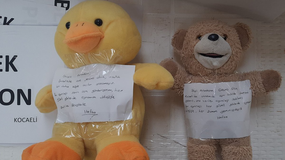 Bir çocuk, "Çok kötü günler geçiriyoruz, sizler için en sevdiğim oyuncaklarımı, elbiselerimi gönderiyorum. Hepinizi çok seviyorum" yazarken, Asya Alkan ise "Oyuncak ve kitaplarımızı sizlere gönderiyoruz" yazarak mektup arkadaşı olmak istediğini belirtti. Hafsa Ekinci ise oyuncak ayının üzerine "Sevgili arkadaşım geçmiş olsun. Kocaeli'de annem de aynı şekilde depremi yaşamış, ona verilen oyuncağı saklamış. Bu oyuncağı hep güzel günlerde oynaman dileğiyle, her zaman yanınızdayız" yazdı.