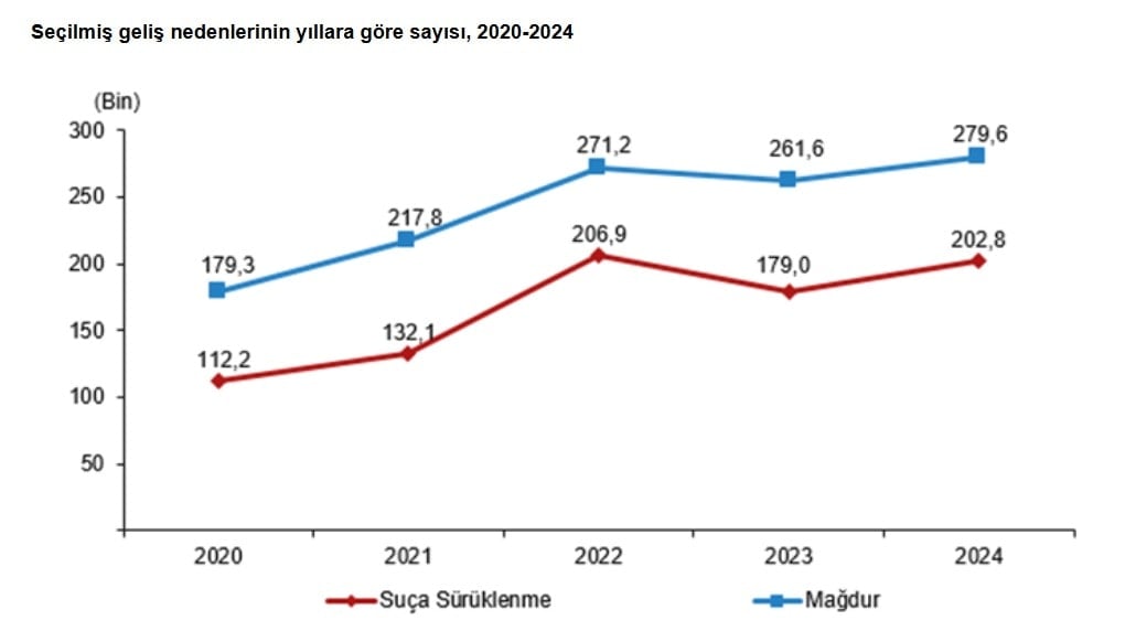 TÜİK tarafından hazırlanan, güvenlik birimine gelen veya getirilen çocuk istatistiklerine göre 2020-2024 yılları arasında suça sürüklenen çocuk sayısı neredeyse bir kat arttı.