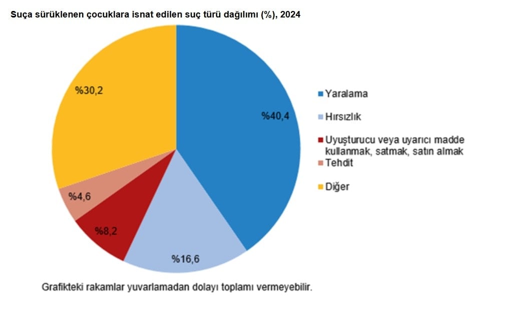Güvenlik birimine gelen veya getirilen çocukların karıştığı olayların 202 bin 785'i suça sürüklenme nedeni ile gerçekleşti. Bu çocukların %40,4'üne yaralama, %16,6'sına hırsızlık, %8,2'sine uyuşturucu veya uyarıcı madde kullanmak, satmak veya satın almak, %4,6'sına tehdit, %4,2'sine genel tehlike yaratan suçlar, %26,0'ına ise bu nedenlerin dışında kalan diğer suçlar isnat edildi.