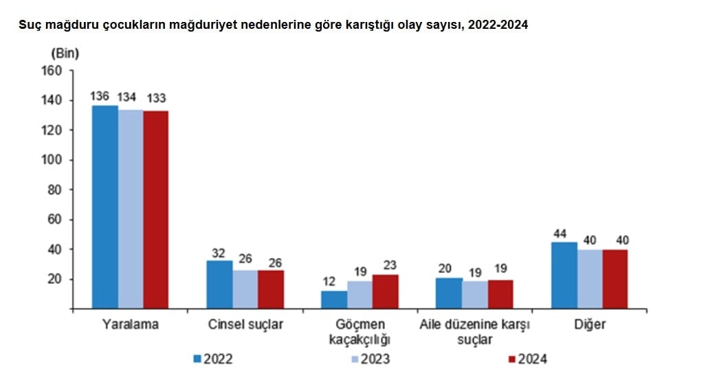 Güvenlik birimlerine gelen veya getirilen çocukların karıştığı olay sayısı 2024 yılında, 2023 yılına göre %9,8 oranında artarak 612 bin 651 oldu. Bu olaylarda çocukların 279 bin 620'si mağdur olarak 202 bin 785'i suça sürüklenme sebebiyle (kanunlarda suç olarak tanımlanan bir fiili işlediği iddiasıyla), 96 bin 438'i bilgisine başvurma amacıyla, 18 bin 561'i kayıp (hakkında kayıp müracaatı yapılıp daha sonra bulunan) olması sebebiyle, 8 bin 729'u kabahat işlediği iddiasıyla, 6 bin 518'i ise bu nedenlerin dışında kalan diğer nedenlerden dolayı güvenlik birimlerine geldi veya getirildi.
