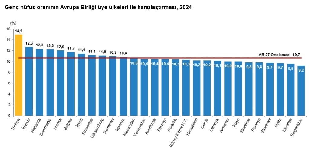 AB üyesi 27 ülkenin genç nüfus oranları incelendiğinde, 2024 yılında genç nüfus ortalaması %10,7 oldu. AB üye ülkeleri arasında en yüksek genç nüfus oranına sahip olan ülkelerin sırasıyla %12,6 ile İrlanda, %12,3 ile Hollanda ve %12,2 ile Danimarka olduğu görüldü. Genç nüfus oranının en düşük olduğu ülkeler ise sırasıyla %9,2 ile Bulgaristan, %9,5 ile Litvanya, %9,7 ile Malta ve Slovenya olduğu görüldü. Türkiye'nin genç nüfus oranının %14,9 ile AB üye ülkelerinin genç nüfus oranlarından daha yüksek.