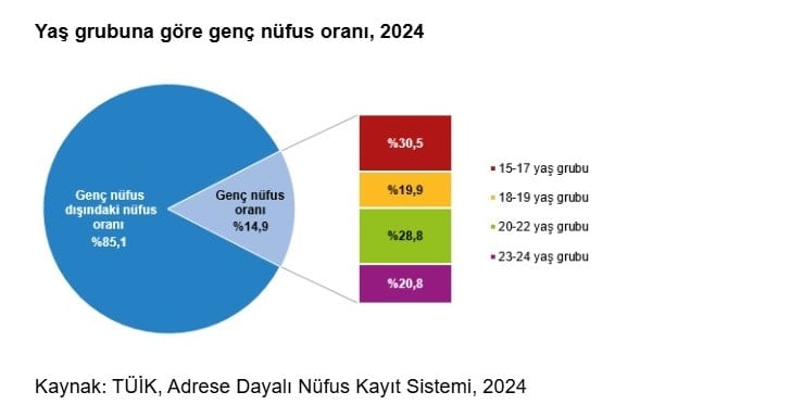 Avrupa’nın en genç nüfusuna sahip olan ülkemizde adrese dayalı nüfus kayıt sistemi sonuçlarına göre 2024 yıl sonu itibarıyla Türkiye'nin toplam nüfusu 85 milyon 664 bin 944 kişi iken 15-24 yaş grubundaki genç nüfus 12 milyon 763 bin 159 kişi oldu. Genç nüfus, toplam nüfusun %14,9'unu oluşturmakta.