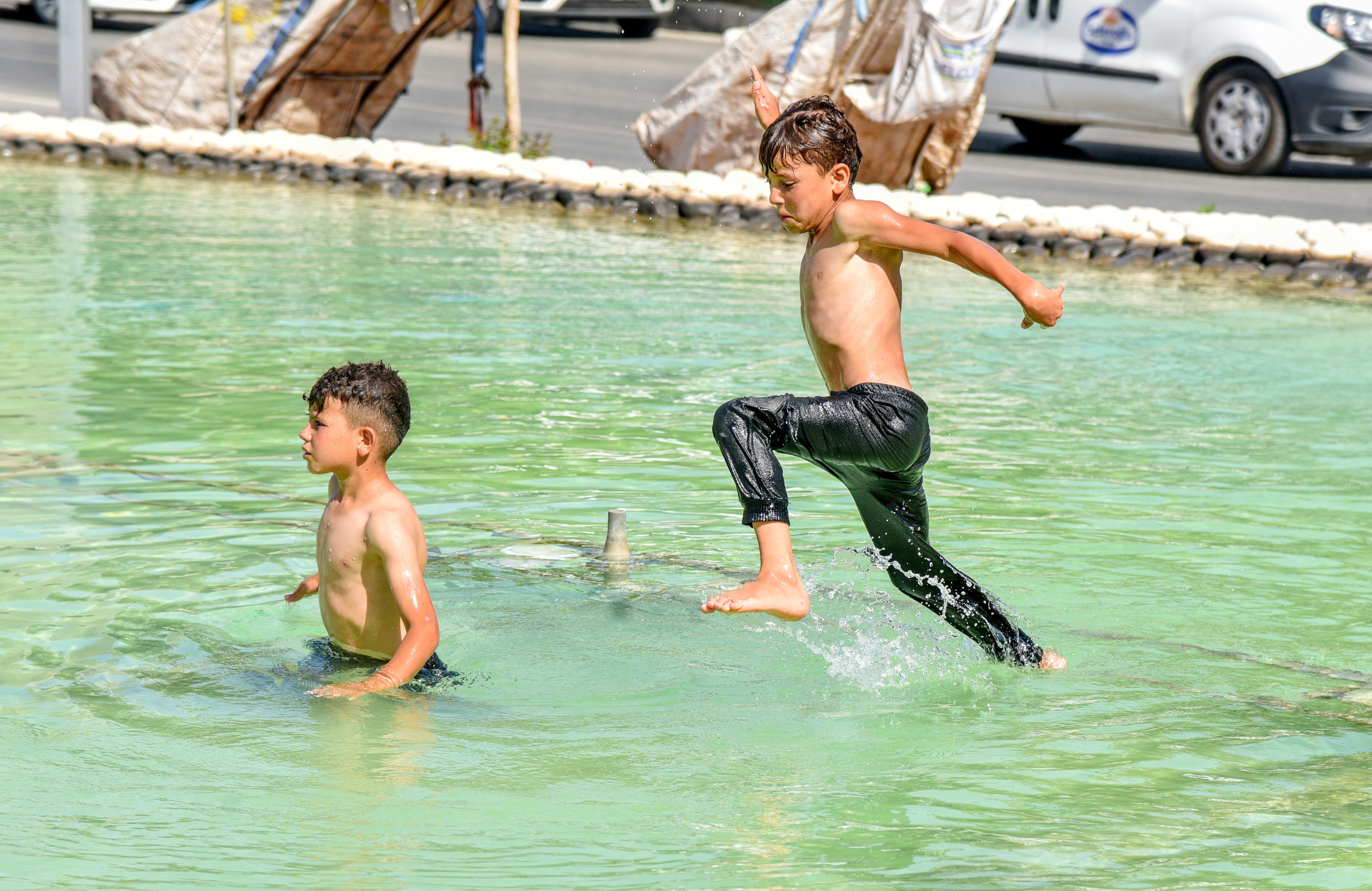 Antalya'da yol kenarı ve kavşaklardaki süs havuzları, çocukların oyun alanı oldu. Sıcaktan bunalan çocuklar, arkadaşlarıyla süs havuzlarında eğlenceli vakit geçirip serinleyip tercih etti.