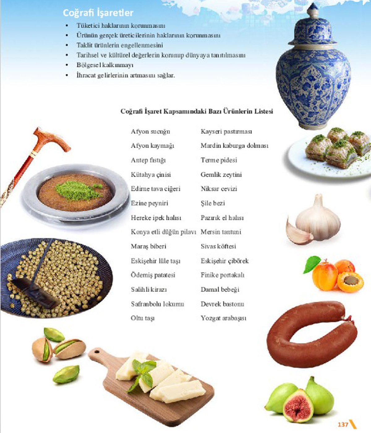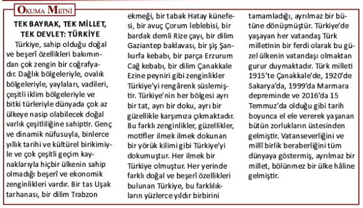 9. sınıf. 3. bölüm: AKP’nin seçim sloganı, “Tek bayrak, tek millet, tek devlet” diye başlıyor. “Bir tas Uşak tarhanası, bir dilim Trabzon ekmeği, bir tabak Hatay künefesi, bir avuç Çorum leblebisi, bir avuç Malatya kayısısı, bir bardak demli Rize çayı, bir dilim Gaziantep baklavası, bir parça Erzurum Cağ Kebabı, Çanakkale ezine peyniri gibi zenginlikler Türkiye’yi süslemiştir” deniliyor.
