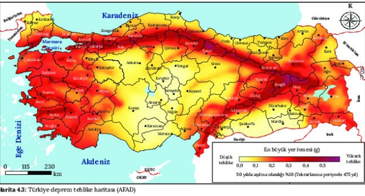 11. sınıf ders kitabı 240. sayfa: “Kuzey Anadolu Fayı, Batı Anadolu Fayı ve Doğu Anadolu Fayı, Türkiye’deki aktif 3 faydır. Bu faylar ülke yüzölçümünün yüzde 66’sını oluşturup, nüfusun yüzde 71’i yaşar. Doğu Anadolu’dan başlayan fay Amik Ovası, Kahramanmaraş, Bingöl, Van ve Hakkari’ye uzanır. Aktif fay hatları olan bu alanlar en tehlikeli deprem bölgesidir.”