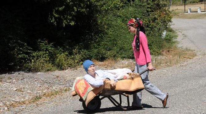 Çaycuma Muhsinler Köyü'nde 26 yıl önce ağaçtan düşerek belden aşağısı felç olan 55 yaşındaki Naciye Menteşe, kalçasının üzerine oturamadığı için dışarıya ancak yakınlarının yardımıyla el arabasında çıkabiliyor.